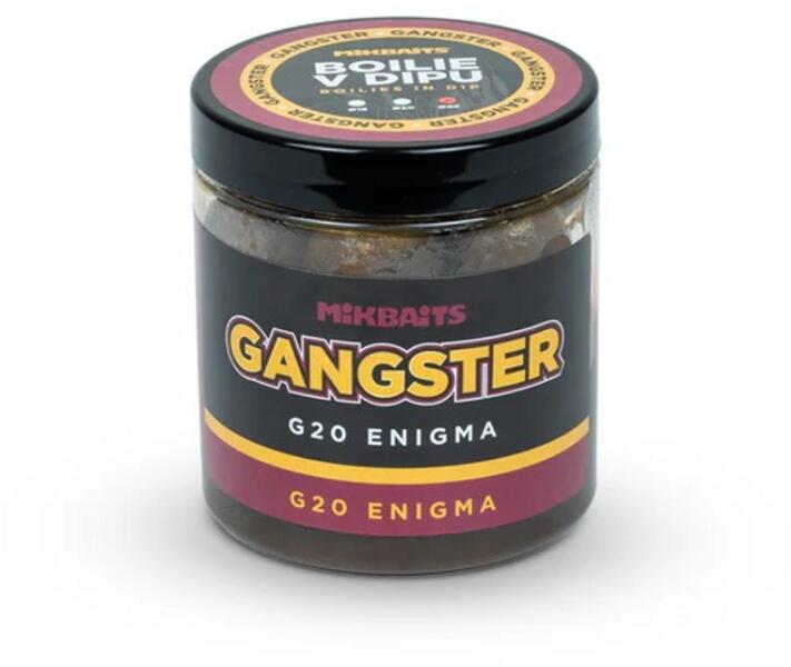 A dipelt bojli a hagyományos bojli lágyabb, még vonzóbb változata . Különösen olyan helyzetekben ideális, amikor feltűnőbb csalit szeretnél használni, mint az etetésre szánt bojlik. Emellett akkor is kiváló választás, ha más méretű csalival szeretnél horgászni, mint amivel etetsz. A bojlikat még a dipbe mártás előtt a legjobb folyékony tápanyagokkal itatjuk át , majd ezt követően helyezzük a tégelybe és öntjük le dippel . Ez az eljárás rendkívüli vonzóerőt biztosít a csalinak, amit a fogások eredményessége is bizonyít . A Gangster G20 Enigma nemcsak az egyedülálló, 60%-os haltartalmú lisztkeverékének és 9%-os kivonattartalmának köszönheti sikerét, hanem hasonlóan a legendás G2-höz, a kiváló minőségű folyékony tápanyagoknak, esszenciáknak és illóolajoknak , beleértve az elképesztő szardinia kivonatot . Az összetevők kombinációja annyira összetett, hogy ez az íz az Enigma nevet kapta . A G20 elnevezés a gyár   húszéves évfordulójára utal. Ez egy egész évben eredményesen használható bojli, amely remekül működik  jól mind meleg, mind hideg vízben . Kiválóan teljesít nagy tavakon, kavicsbányatavakon , valamint kisebb folyókban és tavakban is. A Gangster sok tapasztalt pontyhorgász számára   egyértelműen jó  választás , ha nagy halakra horgászol , rangos versenyeken indulsz  vagy ismeretlen, illetve nehéz vizekre szeretnél egy igazán megbízható csalit. A bojli erőteljesen sós, tengeri ízvilágú , nagyon kemény , és akár 48 órán keresztül is kibírja a horgon. Kevés etetés mellett is hatékony , a halak azonnal reagálnak rá, de minél hosszabb ideig és többet etetünk vele, annál jobb eredményeket hoz. Összetétel: